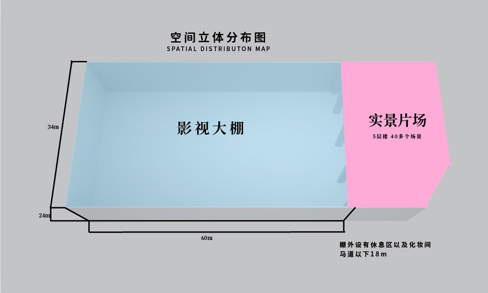 影视大棚面积超2000㎡,长60mx宽34mx高24m,马道下18m,可自由分割组合,包含影视棚、汽车棚、无影棚、数字棚、多功能拍摄棚等,片场电梯直通马道,马道每平米可承重500公斤,配备:格力中央空调、新风系统、喷淋系统、排水系统、吊装系统、数字灯控、智能消防、电动转盘、电控幕布等。汽车棚内配备了全自动的专业汽车电动转盘,能轻松实现汽车或大部分产品360度拍摄,或作为线下活动的旋转展台使用。棚内不仅可以满足目前市场上平面、视频在内的全品类的广告、影视拍摄需求,亦可作为举办大型商业活动的场地。